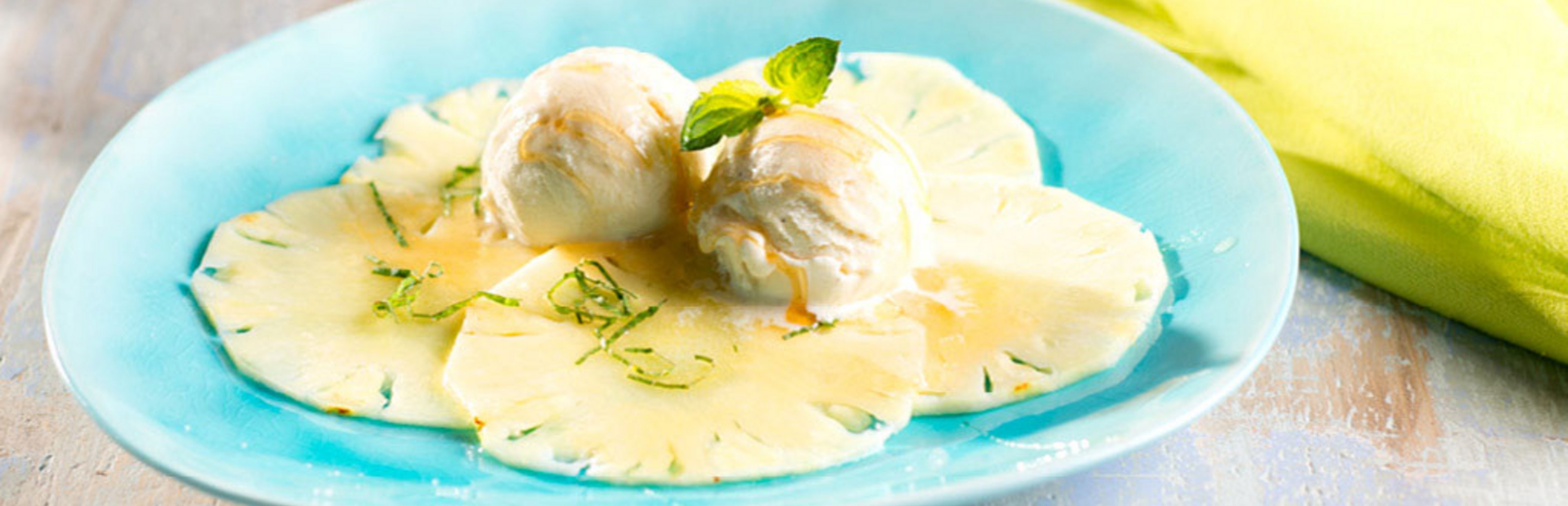 Ananasscheiben auf einer Platte anrichten. Mit Minze und Zucker bestreuen, Rum und Limettensaft darüber träufeln. Das Eis darauf verteilen und sofort servieren.