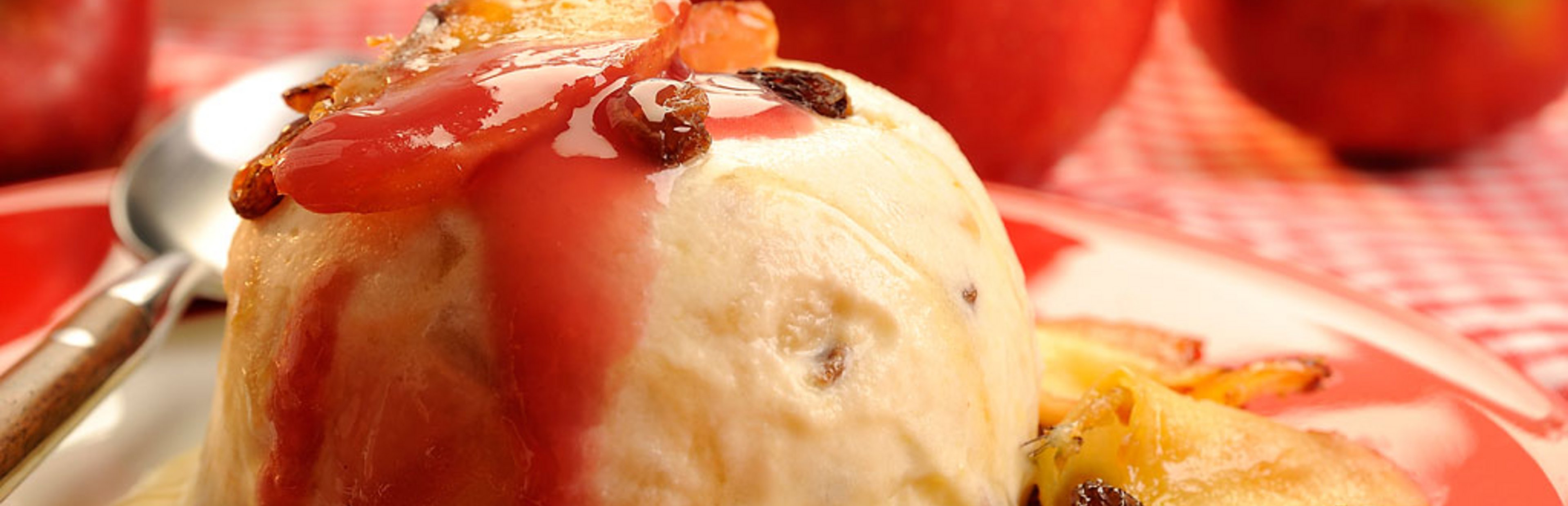 4 Äpfel schälen und in Stücke schneiden. In einer Pfanne mit etwas Butter braten, anschließend pürieren. Mit Zimt abschmecken. Die restlichen beiden Äpfel schälen, in Würfel schneiden und in Butter kurz anbraten. Mit Amaretto ablöschen. Das Apfelmus unter die Eimasse rühren. Die Sahne, Rosinen, Haselnüsse und Apfelwürfel vorsichtig unterheben.