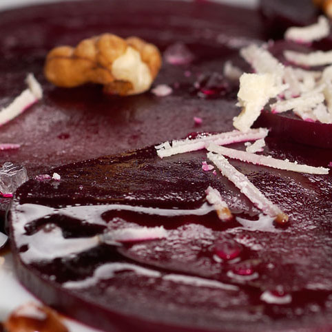 Die Rote Bete in Salzwasser und dem Kräuteressig garen. Schälen und in dünne Scheiben schneiden. Die Scheiben mit grobem Salz und Pfeffer würzen, mit gehobeltem Parmesan und Walnusskernen bestreuen. Anschließend mit Balsamico, Oliven- und Walnussöl beträufeln.