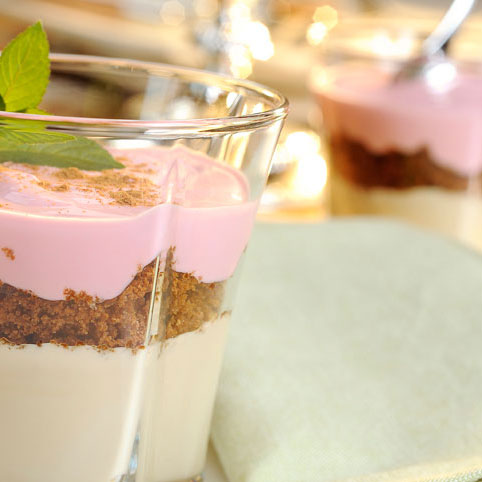 Quark mit Saft verrühren. Die Eiweiße mit einem EL Rohrohrzucker sehr steif schlagen. Sahne ebenfalls steif schlagen und mit den restlichen Zutaten unterheben. Durchschlag mit einem Geschirrtuch auslegen und die Quarkmasse ca. 12 Std. abtropfen lassen. Kühl stellen. Honigkuchen ausstechen (Glasgröße), 2/3 Quark und 1/3 roter Quark mit dem Honigkuchen trennen und mit Zimt bestreuen. Mit Melisse dekorieren. Fertig!