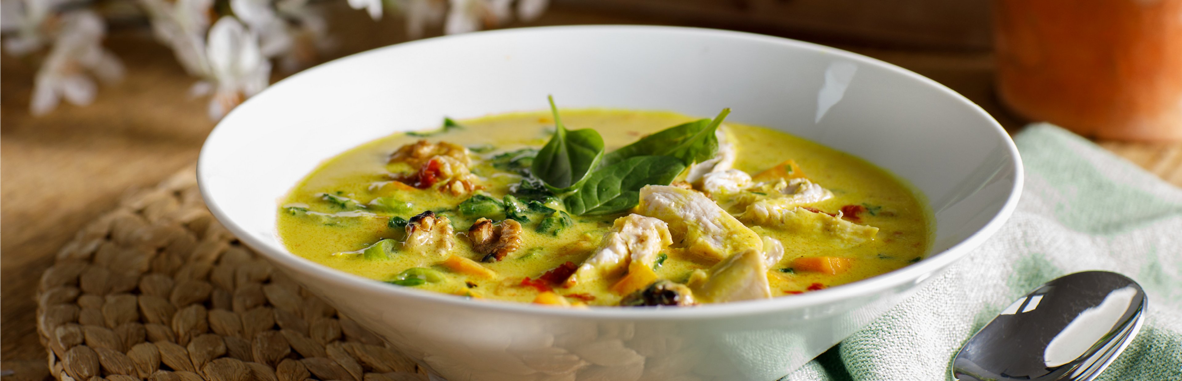 Cremige Hühnersuppe mit Kokosmilch und Spinat