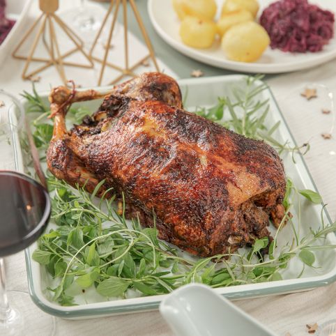 Ganze Ente mit Rotkohl und Kartoffel-Klößen