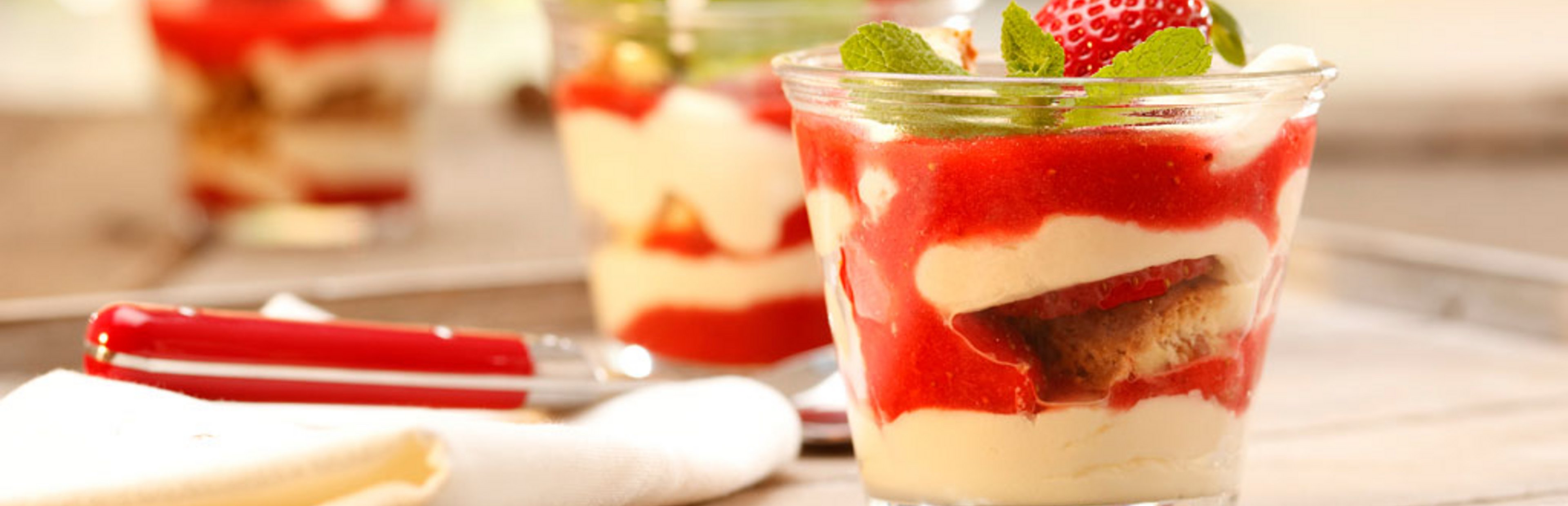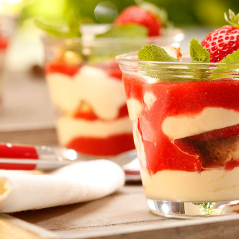 Vier schöne Erdbeeren für die Garnitur zur Seite legen. Die restlichen Erdbeeren mit ein wenig Puderzucker pürieren. Amaretto oder Rum nach Geschmack hinzugeben. Die Cantuccini leicht zerdrücken.