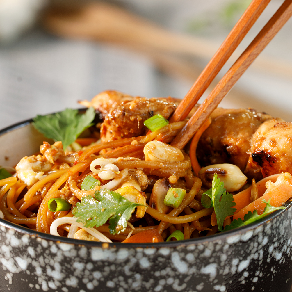 Die Hähnchenwürfel auf den Holzspießen aufspießen und in der Pfanne anbraten. Dann die Hitze reduzieren und die restliche Sauce hinzugeben und erhitzen. Sobald die Hähnchenspieße durch sind, die Erdnusssauce über die Nudeln verteilen und mit den Saté-Spießen und frischen Frühlingszwiebeln und Chili Flocken servieren.