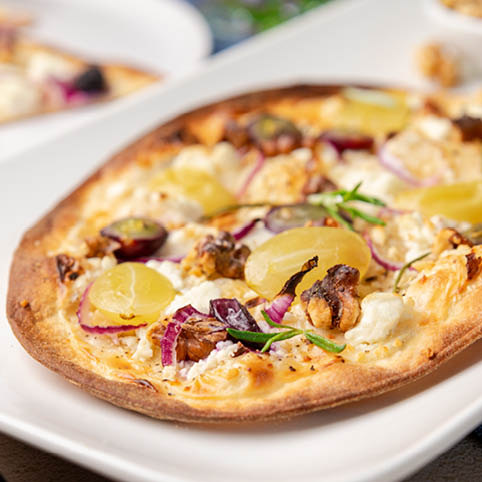 Flammkuchenböden mit Crème frâiche bestreichen und mit Salz und Pfeffer bestreuen. Ziegenkäse gebröselt oder in Scheiben auf den Flammkuchen geben. Zwiebel schälen und in dünnen Ringen auf den Böden verteilen. Walnusskerne grob zerkleinern, Trauben Waschen und halbieren und beides auf den Böden verteilen. Den Flammkuchen nach Packungsanleitung backen und mit frischem Rosmarin servieren.