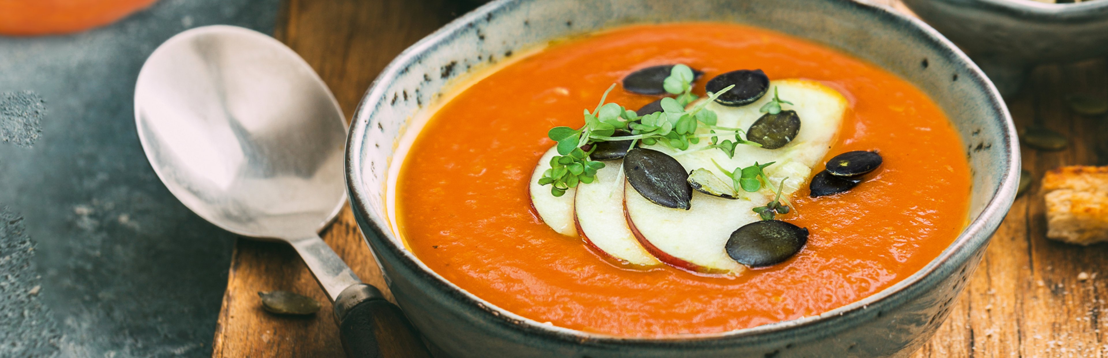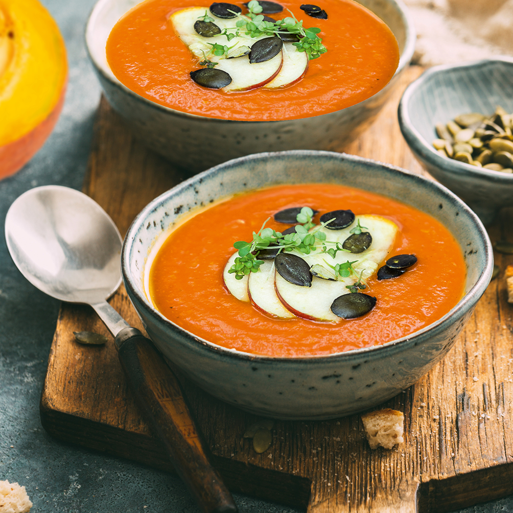 Kürbiskerne grob hacken. Apfel in Spalten schneiden, in Pflanzenfett kurz anbraten. Suppe in tiefe Teller geben, Apfelspalten darauf verteilen und die Kürbiskerne darüber streuen.