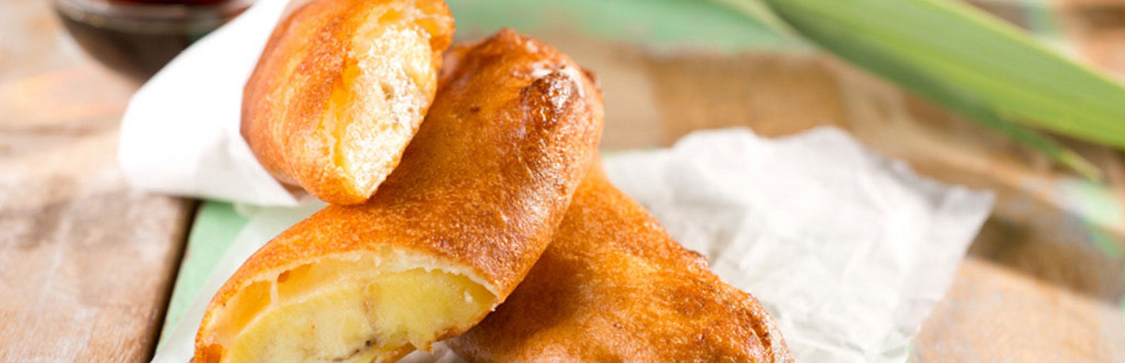 Die Bananen schälen und quer halbieren. Die Bananenhälften durch den Teig ziehen und bei 180 °C frittieren bis der Teig goldbraun ist.