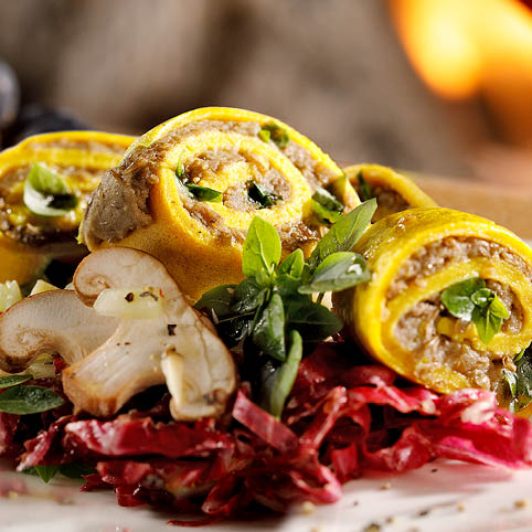 Für die Crêpes: Alle Zutaten zu einem glatten Teig verrühren und diesen etwas quellen lassen. Etwas Öl in einer Pfanne erhitzen. Nacheinander 4 dünne, goldgelbe Crêpes backen. Mit Linsenpüree bestreichen, aufrollen und für ca. 6 Stunden kalt stellen. Anschließend in schräge Scheiben schneiden.