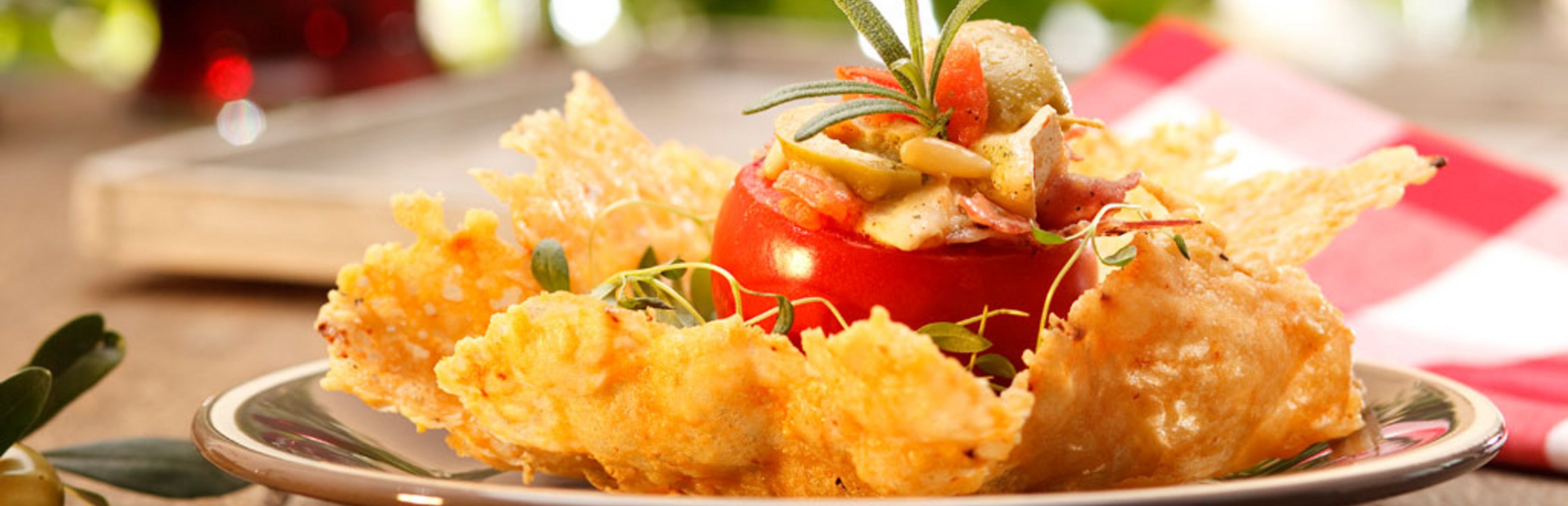 Anschließend in die Tomaten füllen und 2–3 Min. im Ofen gratinieren. Die Tomaten in der Parmesanblüte anrichten und servieren.