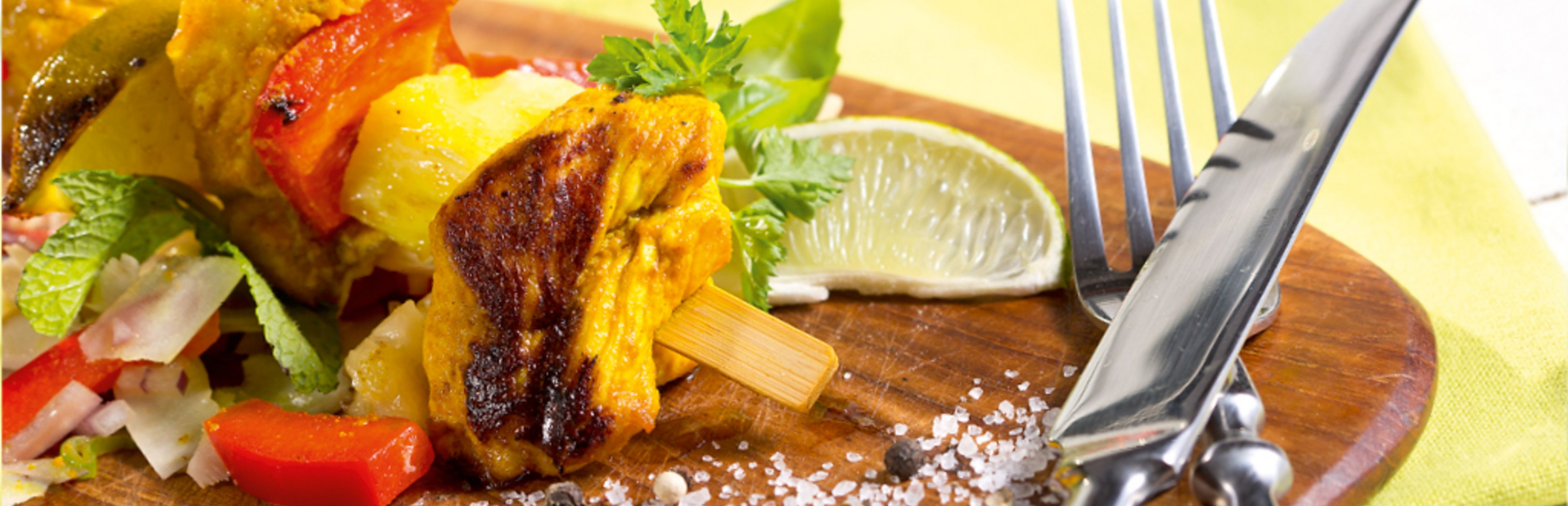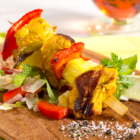 Alle Zutaten für die Marinade miteinander vermischen. Die Hähnchenbrüste würfeln und für 2 – 3 Stunden marinieren. Anschließend abwechselnd mit Obst und Gemüse, z. B. Ananas, Paprika, ... , auf Grillspieße stecken und auf dem heißen Grill rundherum ca. 10 Minuten grillen.