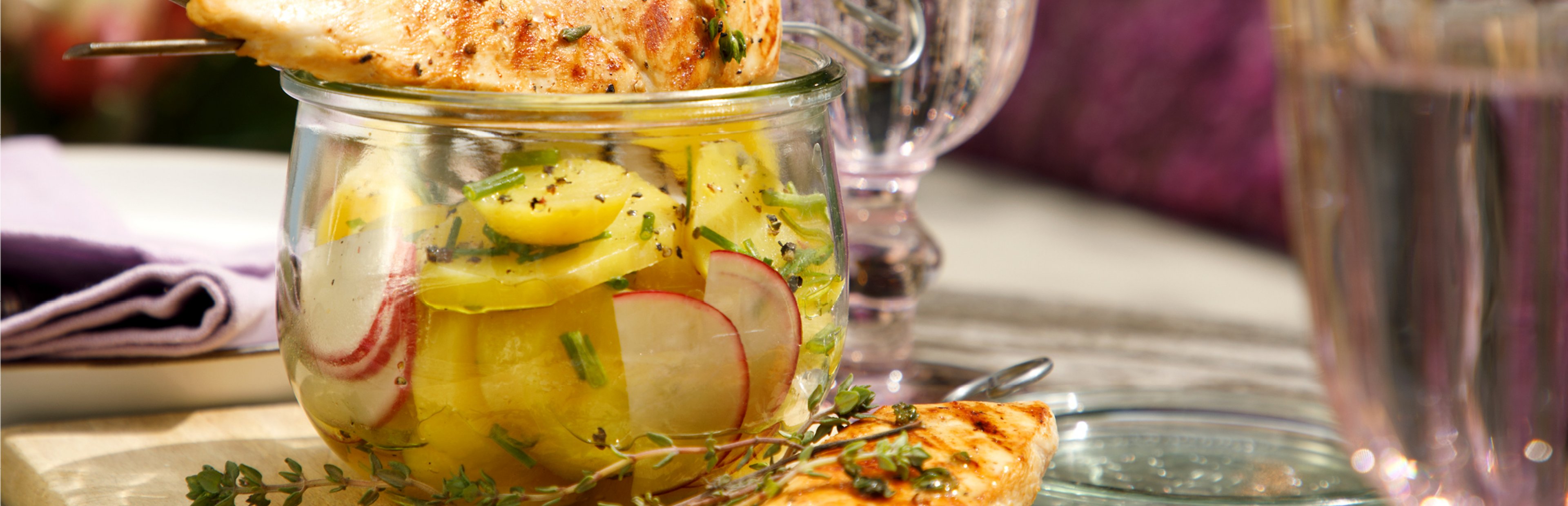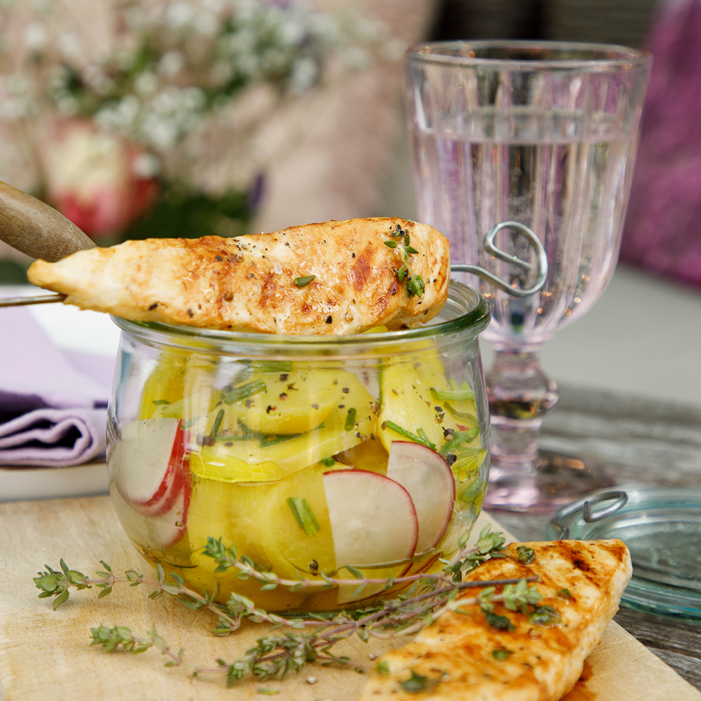 Die Hähnchenbrüste aus der Marinade nehmen und auf dem heißen Grill grillen. Nach dem Grillen mit Salz und Pfeffer würzen. Hierzu passt ein Kartoffelsalat mit Radieschen.