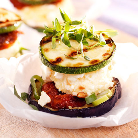Zucchini und Auberginen in Scheiben schneiden und mit Rosmarin und 1 Knoblauchzehe in Olivenöl anbraten. Mit Salz und Pfeffer würzen und die Aubergine auf Küchenkrepp abtropfen. Auf die Aubergine 1 Messerspitze Tapenade, 1 getrocknete Tomate und 1 Scheibe Ziegenfrischkäse setzen. Zum Schluss die gebratene Zucchini drauflegen und mit etwas frischem Thymian bestreuen.