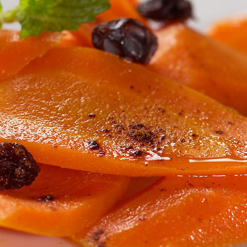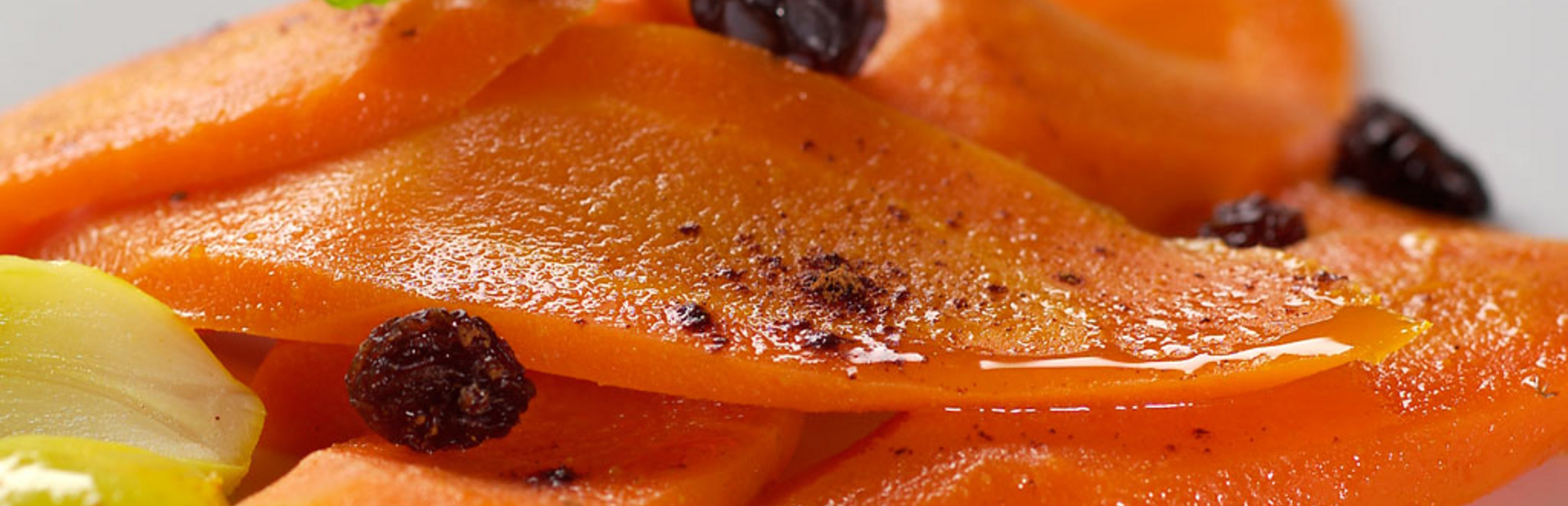 Die Möhren schälen, in Scheiben schneiden und in Olivenöl kurz andünsten. Den Ingwer und die Knoblauchzehen schälen, fein würfeln und zu den Möhren geben. Dann den Zucker (ca. 1 EL), Salz und Balsamico bianco dazugeben.