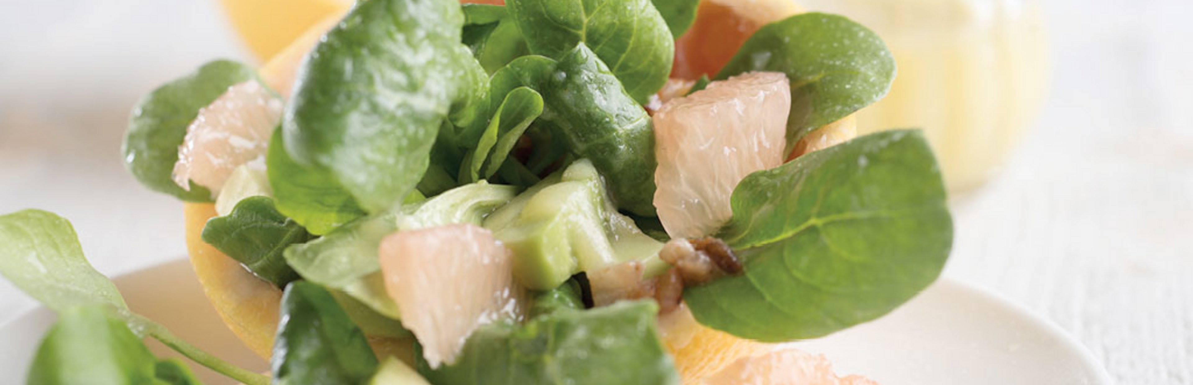 Die Kartoffel kochen. Den Speck in einer Pfanne auslassen, die Schalotte dazugeben, anschwitzen und dann mit Brühe auffüllen. Kartoffel dazukneten, mit Essig, Öl, Salz und Pfeffer würzen. Avocado in feine Streifen schneiden, Grapefruit filetieren und mit dem Feldsalat locker miteinander vermengen. Mit dem Dressing anrichten. Dazu frisches Baguette reichen.