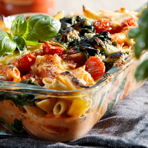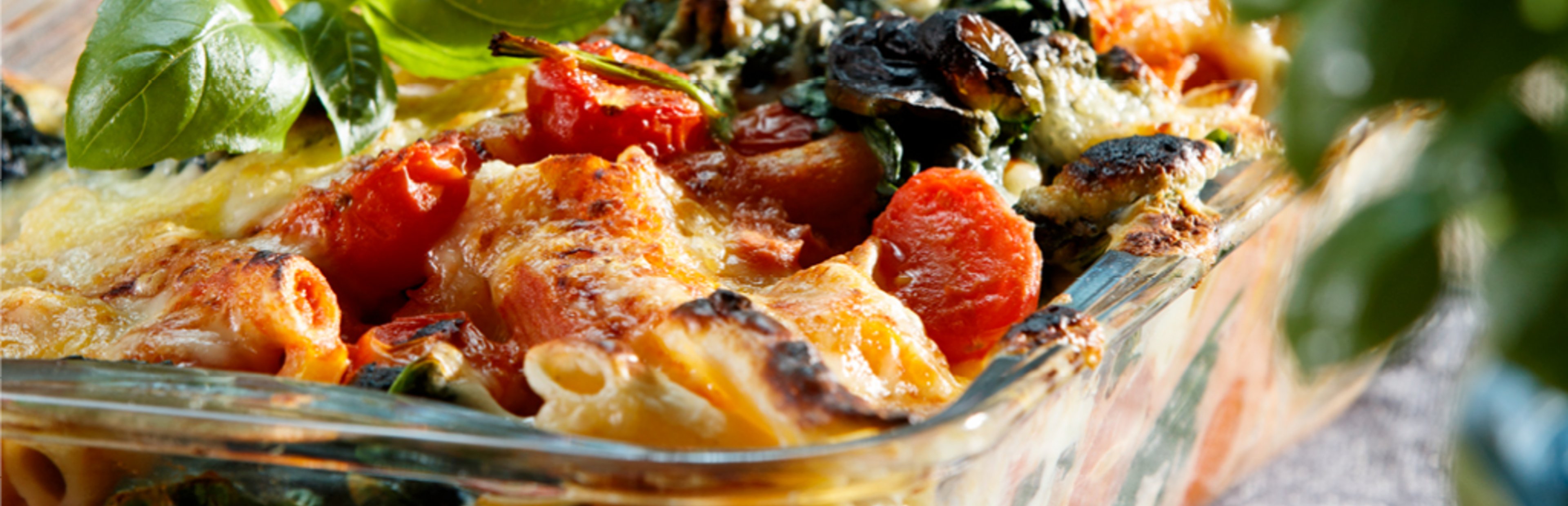 In eine Auflaufform geben, den geriebenen Käse darüber streuen und im Backofen goldbraun gratinieren.