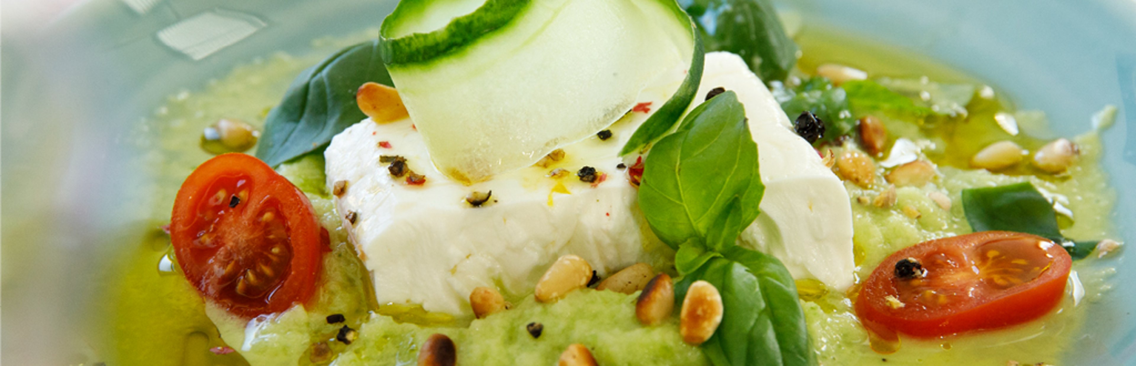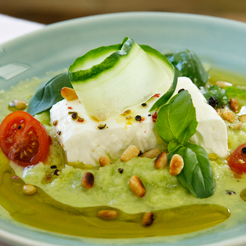 Die Gurken schälen und grob in Stücke schneiden. Die Schalotte putzen und halbieren. Gurke, Schalotte, Öl und Zitronensaft und –abrieb miteinander pürieren. Minze und Basilikum hacken und größtenteils in die Gazpacho geben, mit Salz und Pfeffer abschmecken. Den Feta-Käse achteln und in die Gazpacho geben. Mit den restlichen gehackten Kräutern und einigen roten Beeren garnieren.