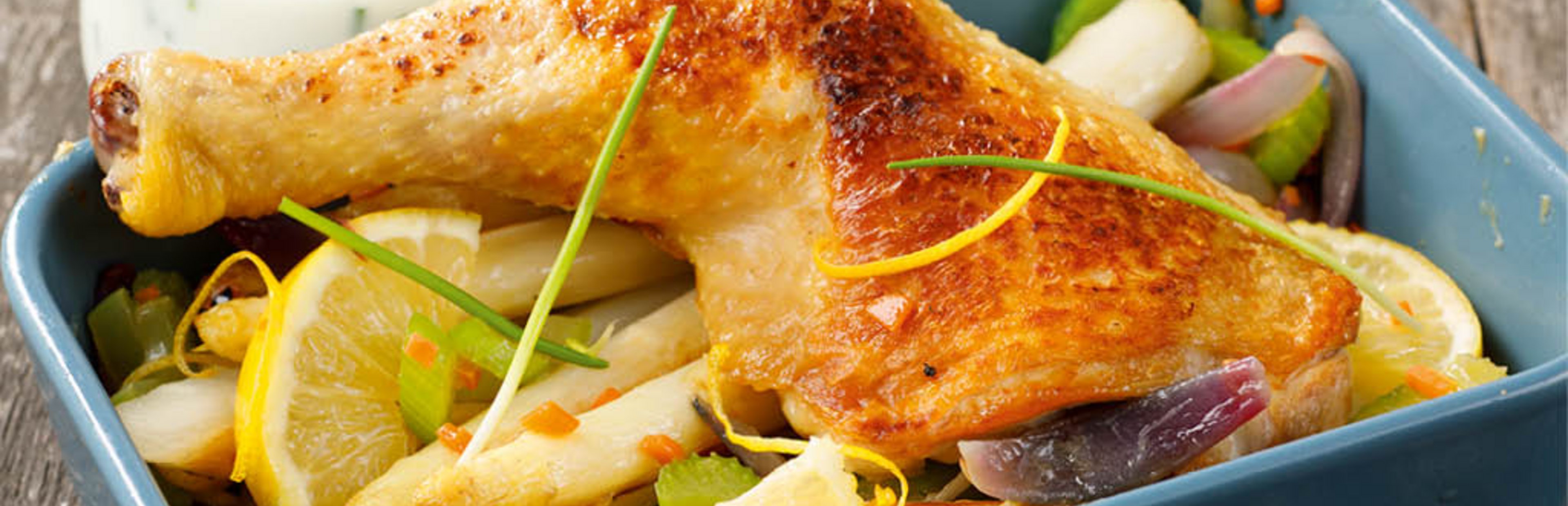 Den Spargel portionsweise auf Tellern verteilen und das Gemüse darüber geben. Dazu jeweils eine Hähnchenkeule mit Zitronenscheiben anrichten.