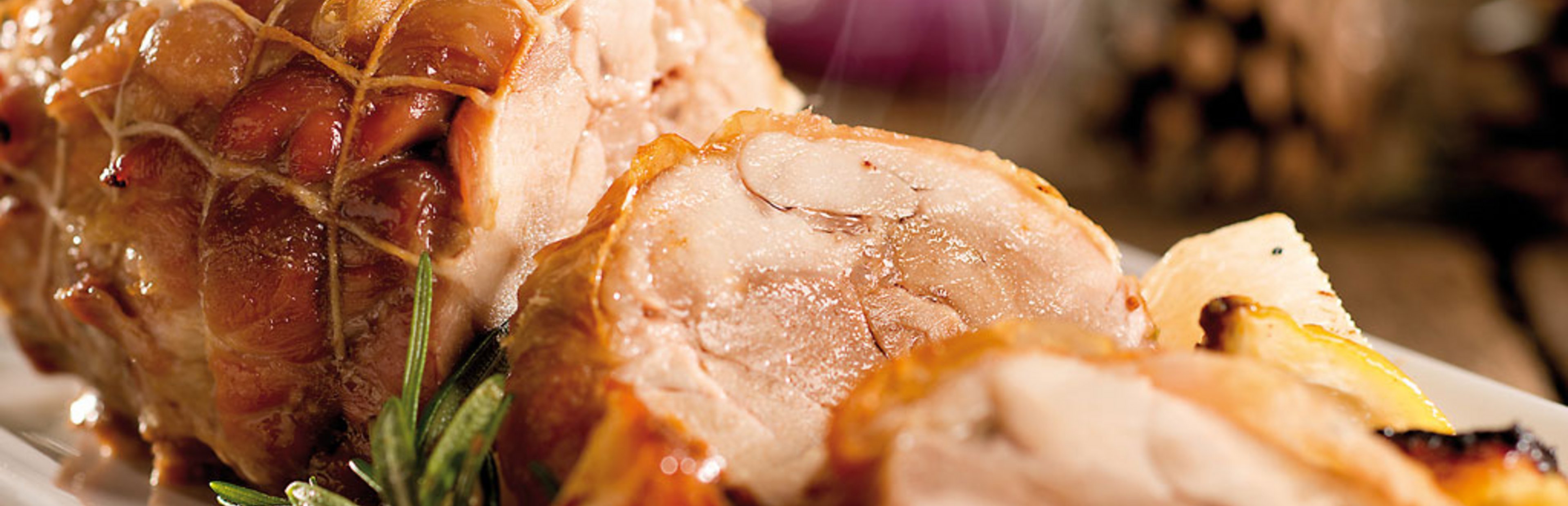 Den Braten ab und zu mit dem Sud begießen. Das Netz entfernen. Braten schneiden und zusammen mit dem Gemüse servieren.