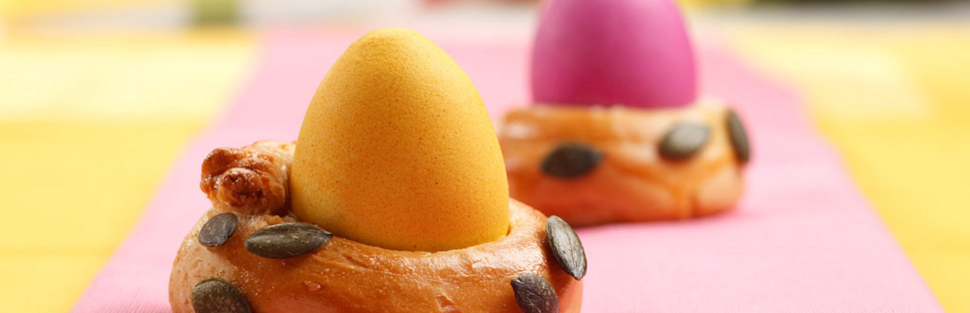 Die frische Hefe mit etwas Milch und dem Zucker mischen. Die restliche Milch mit der zerlassenen Butter und dem Ei verrühren. Das Mehl mit dem Salz mischen und mit der Milchmischung vermengen. Zum Schluss die Hefemasse dazugeben. Das Ganze kurz und kräftig zu einem homogenen Teig kneten, warm stellen und aufgehen lassen. Noch einmal kneten und anschließend zu kleinen Rollen formen. Diese Rollen zu kleinen, runden Nestern drehen, in die später ein gekochtes Ei gesetzt werden kann. Nochmals aufgehen lassen und mit dem verdünnten Eigelb bestreichen. Mit Kürbiskernen verzieren und im Backofen bei 180 °C ca. 15-20 Min. goldbraun backen.