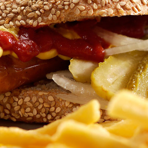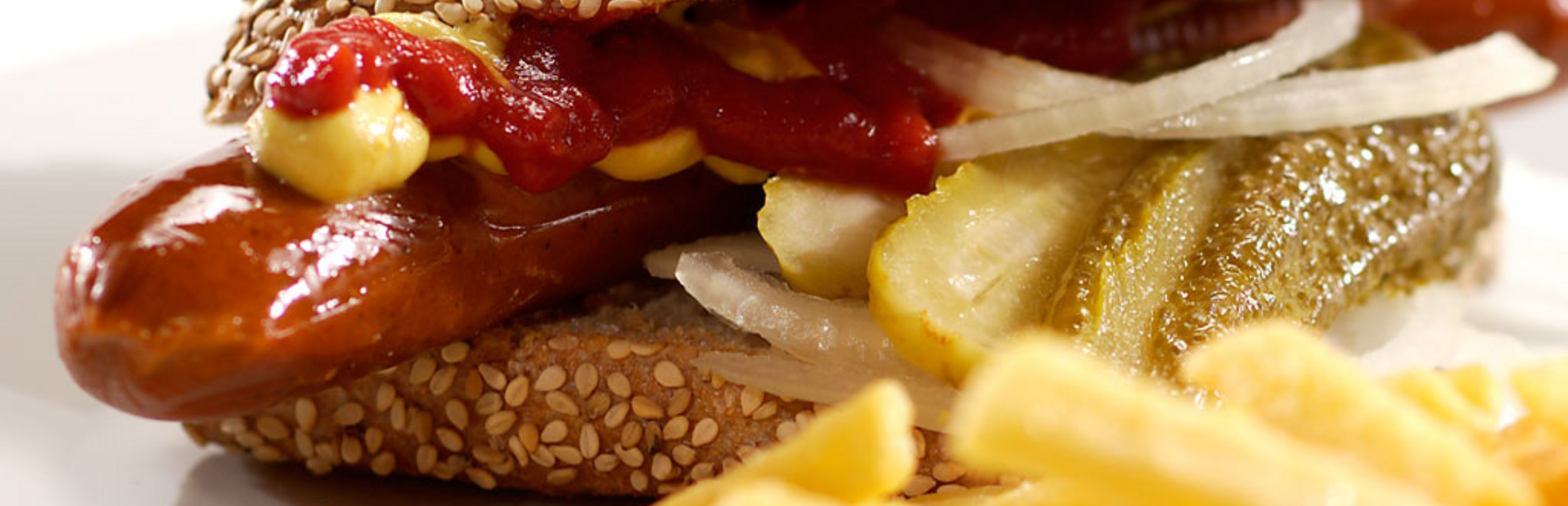 Die Zwiebel und die Cornichons in feine Scheiben schneiden und auf dem Hot Dog verteilen, anschließend die obere Brötchenhälfte aufsetzen.