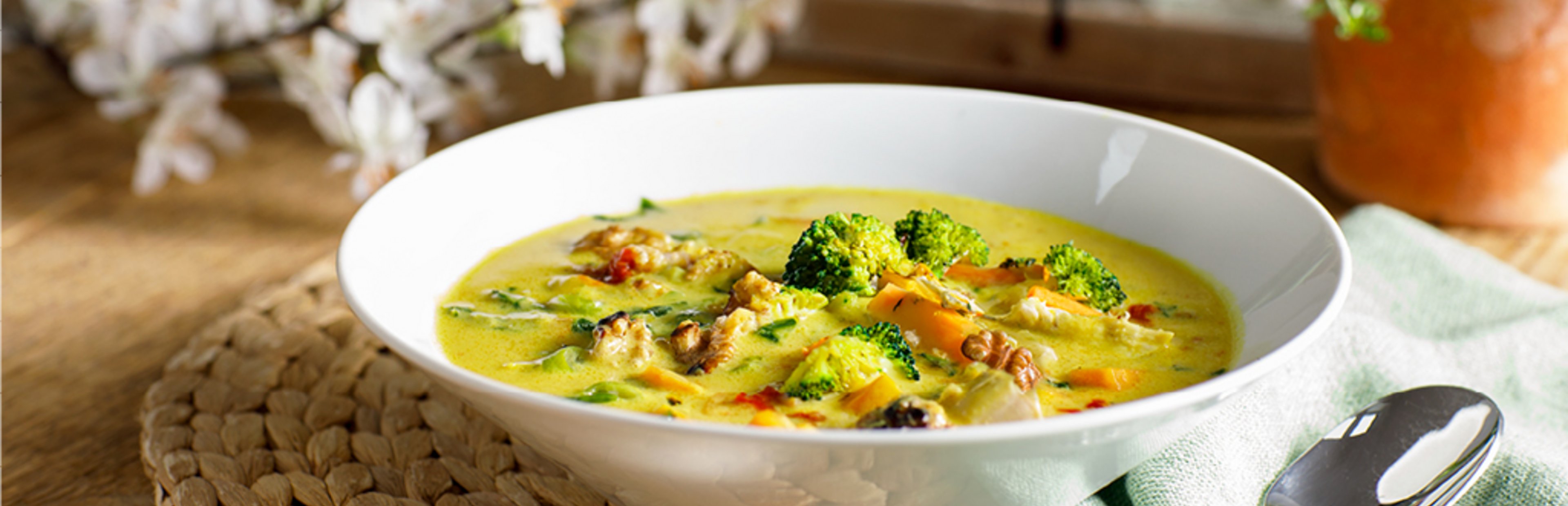 Zwiebel in etwas Olivenöl anschwitzen, einen Teelöffel Currypaste und die Möhrenwürfel hinzugeben, kurz mit braten, das Kurkumapulver hinzugeben, mit 100ml Hühnerbrühe (ohne Fleisch) ablöschen und 8 Minuten köcheln lassen. Die Brokkoliröschen hinzugeben und nochmals 12 Minuten leicht köcheln lassen.