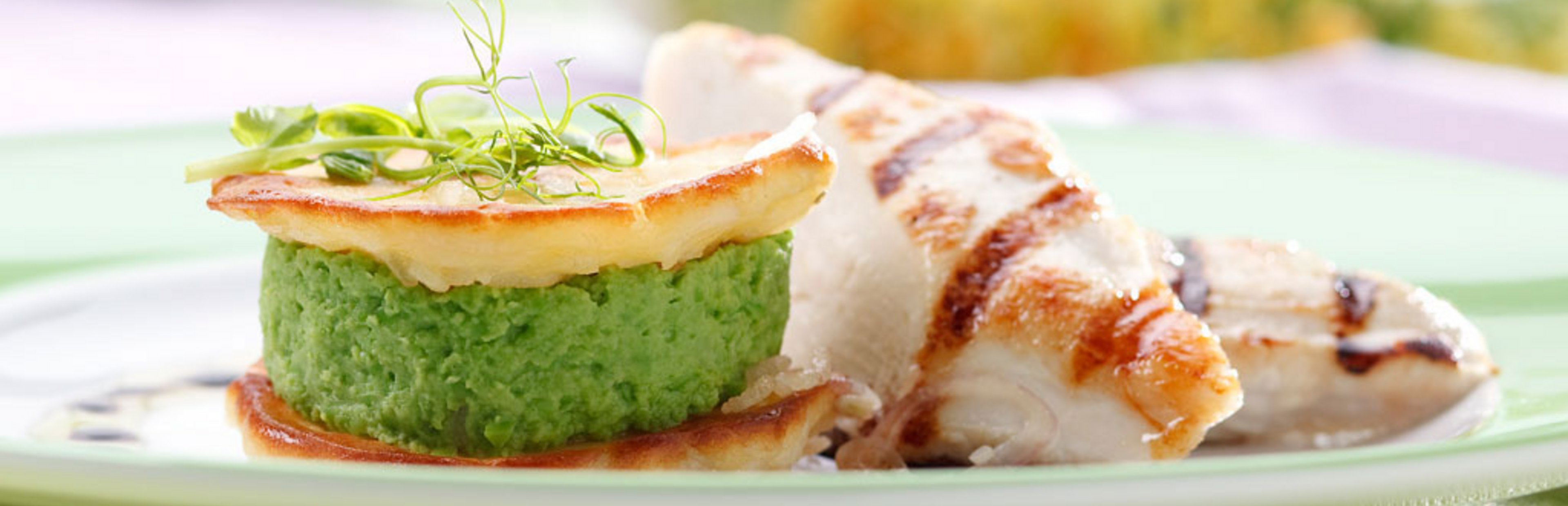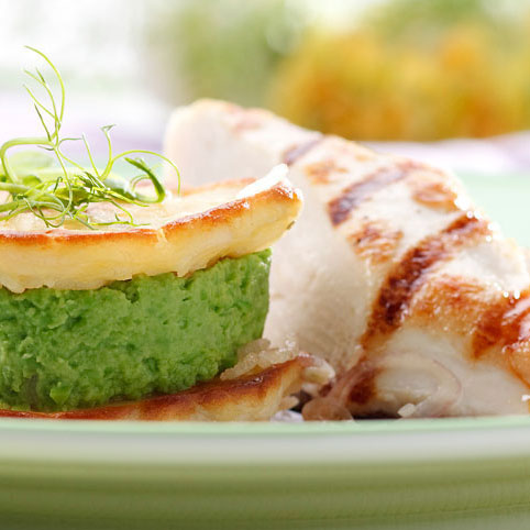 Hühnerbrustfilet mit Erbsenpürree im Reisplätzchen