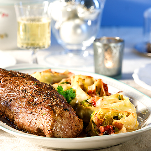 Das Kalbsfilet mit Salz und Pfeffer würzen, in Öl anbraten und bei 150 °C ca. 20 Minuten garen und anschließend weitere 5 Minuten ziehen lassen. Oder alternativ für 1,5 Stunden im Backofen bei 100 °C langsam gar ziehen lassen.