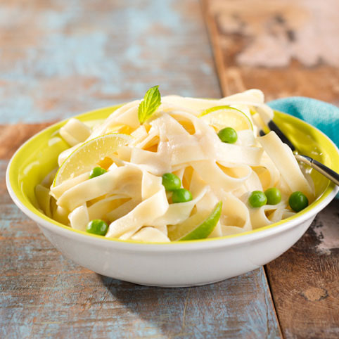 Inzwischen Nudeln in reichlich kochendem Salzwasser nach Packungsanweisung bissfest garen. Die Erbsen zu den Nudeln geben. Brühe zur Sauce geben und aufkochen. Mit Sojasauce und Limettensaft würzen. Nudeln abgießen, kurz abtropfen lassen und mit der Sauce mischen.
