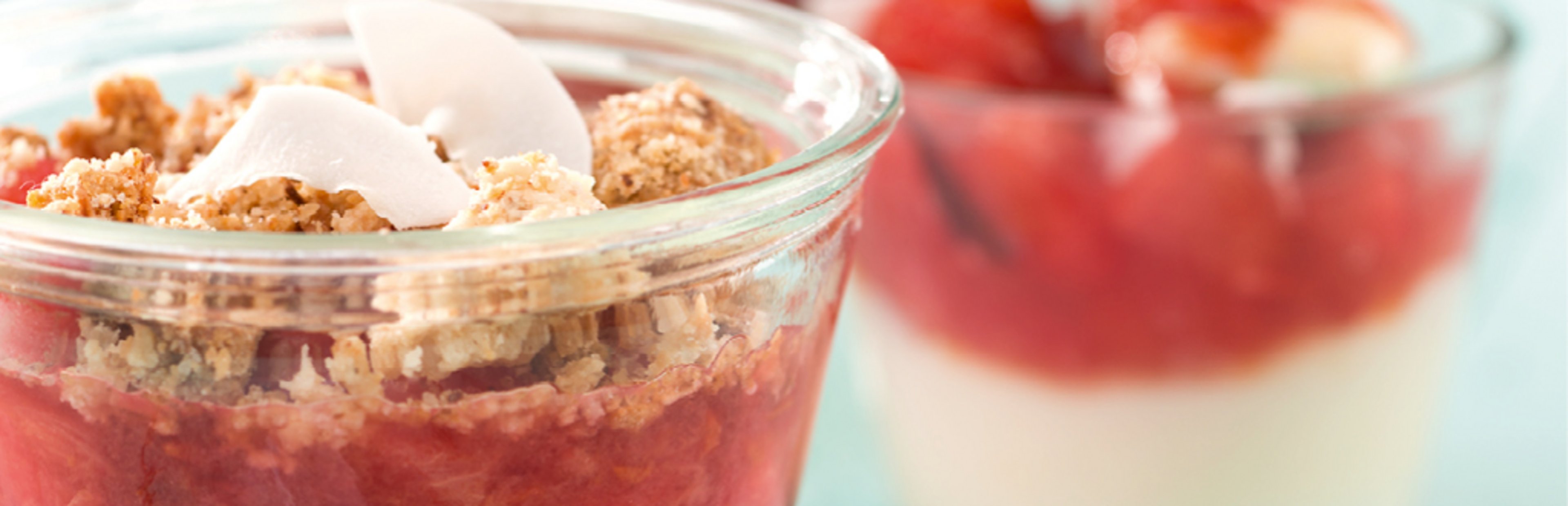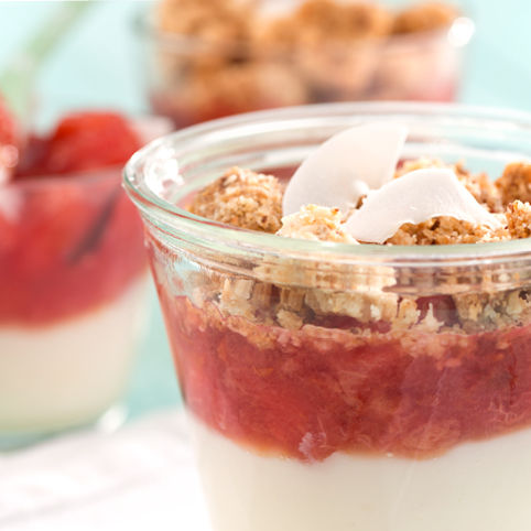 Das Nektarinen-Ragout auf den Kokospudding geben. Mit dem ausgekühlten Crumble bestreuen und servieren.