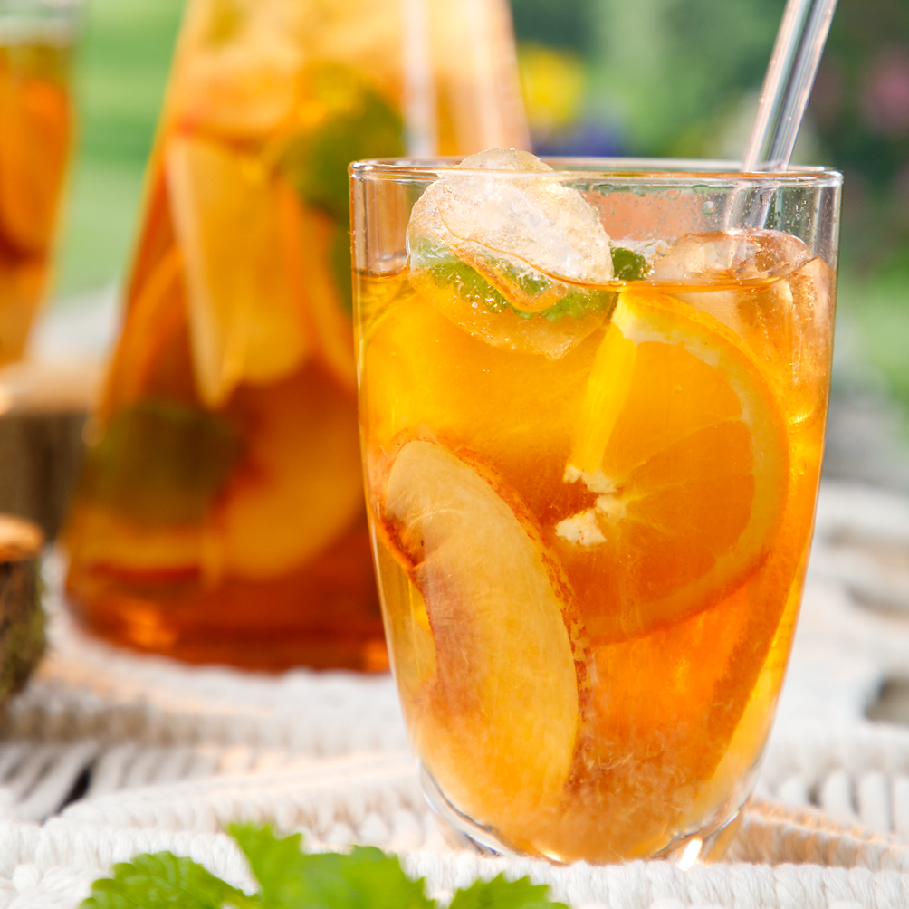 Tipp: Einen Tag vorher eingemachte Pfirsiche pürieren und einfrieren. Den Eistee dann mit den Pfirsich-Eiswürfeln servieren.
