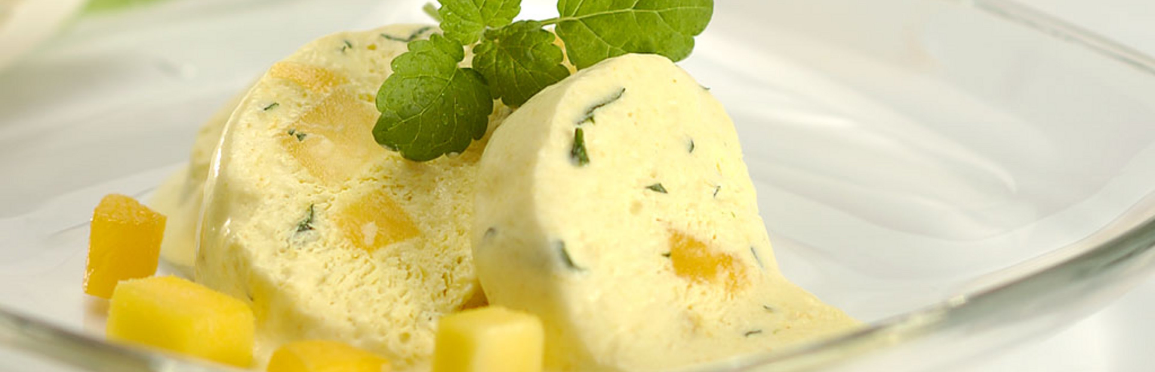 Eier, Eigelbe und Zucker im Wasserbad bei 65-70 C° warm aufschlagen. Anschließend mit dem Mixer schaumig rühren und dabei erkalten lassen. Mangos, Minze und Sahne unterheben.