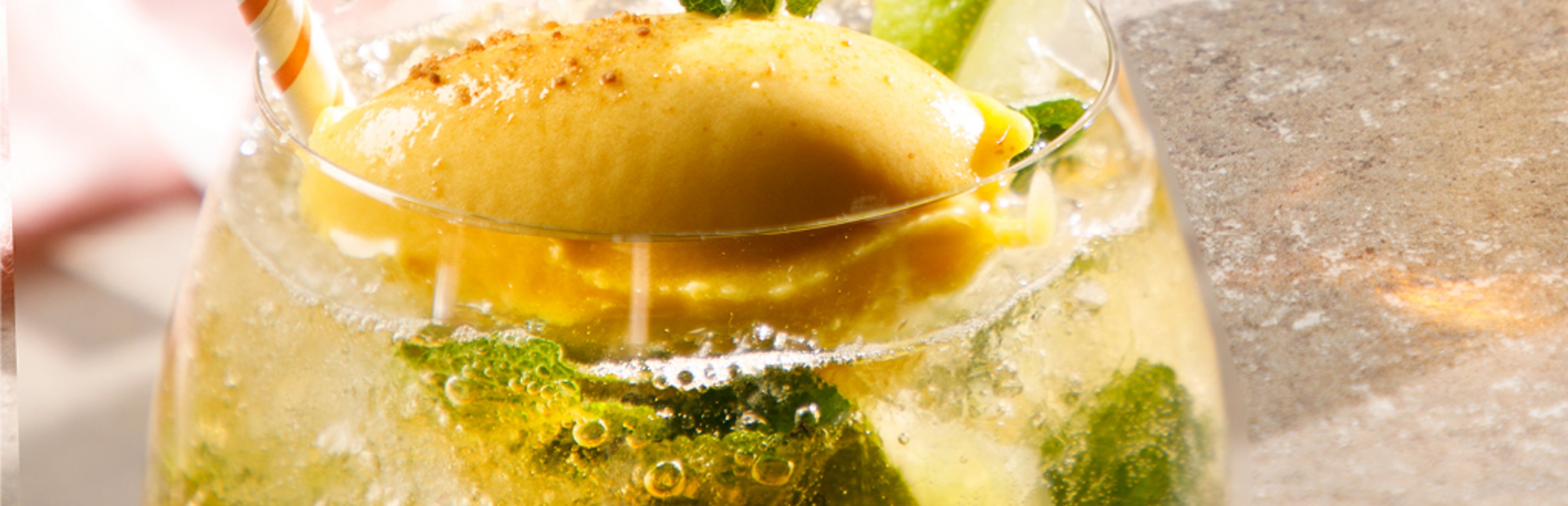 Die Mango schälen, entkernen und in Würfel schneiden. Die Limette vierteln und dann in Stücke schneiden. Limette und Zucker zerstoßen, die Minze dazugeben und mit anstoßen, um die ätherischen Öle freizusetzen. Auf 4 Gläser verteilen. Mangowürfel und crushed ice dazugeben. Mit Tonicwater auffüllen und jeweils 1 EL b*Mangosorbet hingeben. Los geht’s!
