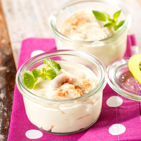 Im Kühlschrank abkühlen lassen bis beim Durchziehen einer Gabel leichte Furchen zurückbleiben. Die Sahne mit dem verbliebenen Zucker steifschlagen und unter die Masse heben. Mit dem Spritzbeutel oder einem Löffel direkt in Gläser füllen und gänzlich fest werden lassen.