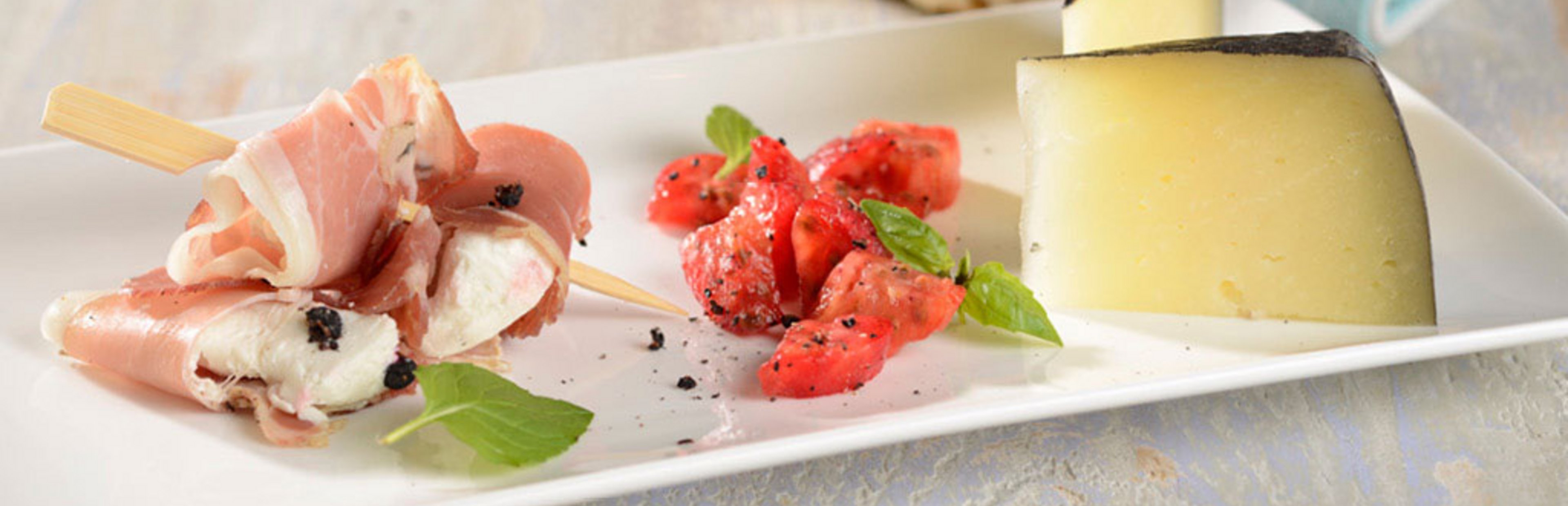 Den Ziegenkäse in kleine Stücke schneiden. Den in Scheiben geschnittenen Schinken flach auslegen, je ein Stück Käse in eine Scheibe einwickeln und den Schinken mit einem Holzspieß fixieren. Die Kaktusfeigen schälen und in Scheiben schneiden. Den Pecorino in zwei große Ecken schneiden und ein wenig davon auf einer groben Reibe reiben. Die Schinkenrollen, Kaktusfeigen und Pecorino-Ecken auf einer länglichen Platte anrichten und den geriebenen Pecorino darüber streuen. Mit Minzblättern dekorieren.