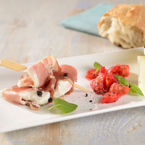 • 1 Ziegenfrischkäse (rund, ca. 100 g)• 80 g Schinken, luftgetrocknet