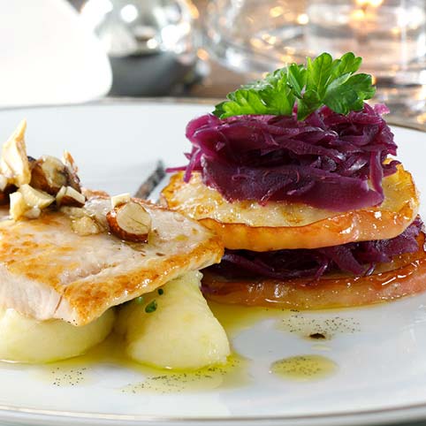 Mit dem servierfertigen Rotkohl abwechselnd schichten. Dazu gebratenen Lachs und Kartoffelpüree servieren.