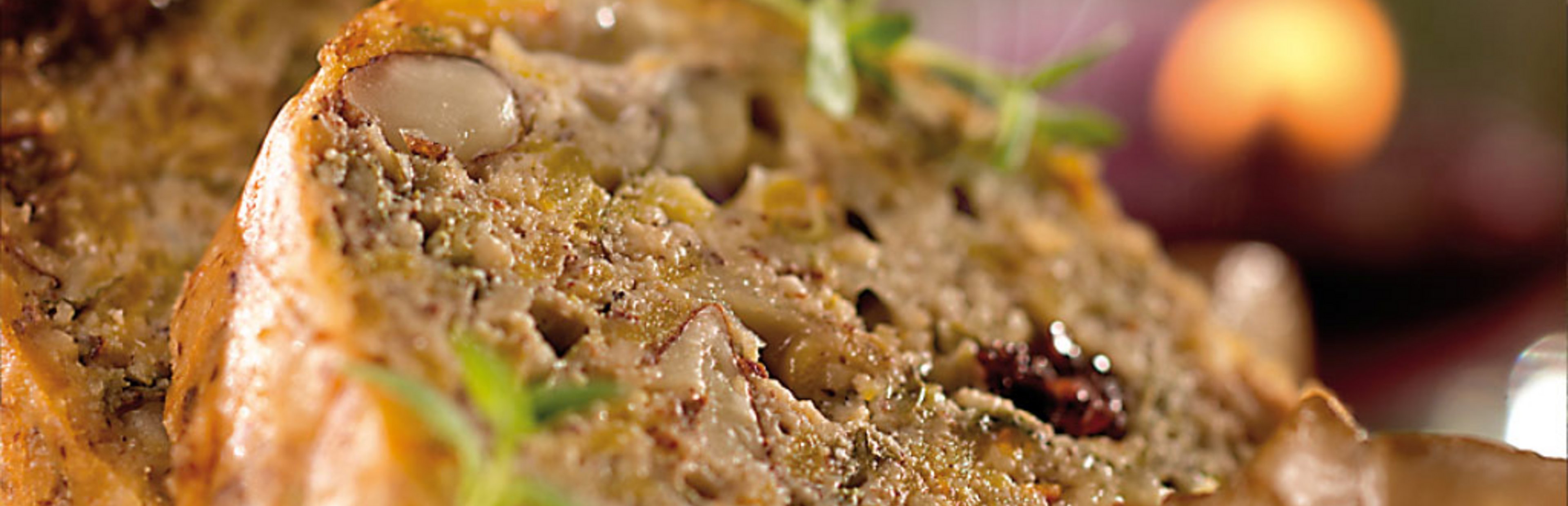 Nüsse mahlen. Die Zwiebeln fein schneiden und in der Pfanne in etwas Kokosöl anschwitzen. Den Kürbis raffeln und dazugeben. In der Zwischenzeit Nüsse, Käse, Eier, Crème fraîche, Kräuter und Cranberries vermengen. Das Gemüse dazugeben und dann alles mit Salz, Pfeffer und Muskat abschmecken. Die Nuss-Kürbis-Mischung in eine mit Backpapier ausgelegte Backform geben. Bei 160° C ca. 50 Min. backen. Evtl. nach 35 - 40 Min. abdecken.