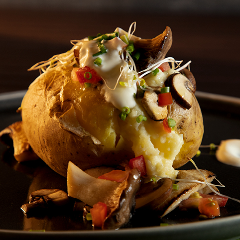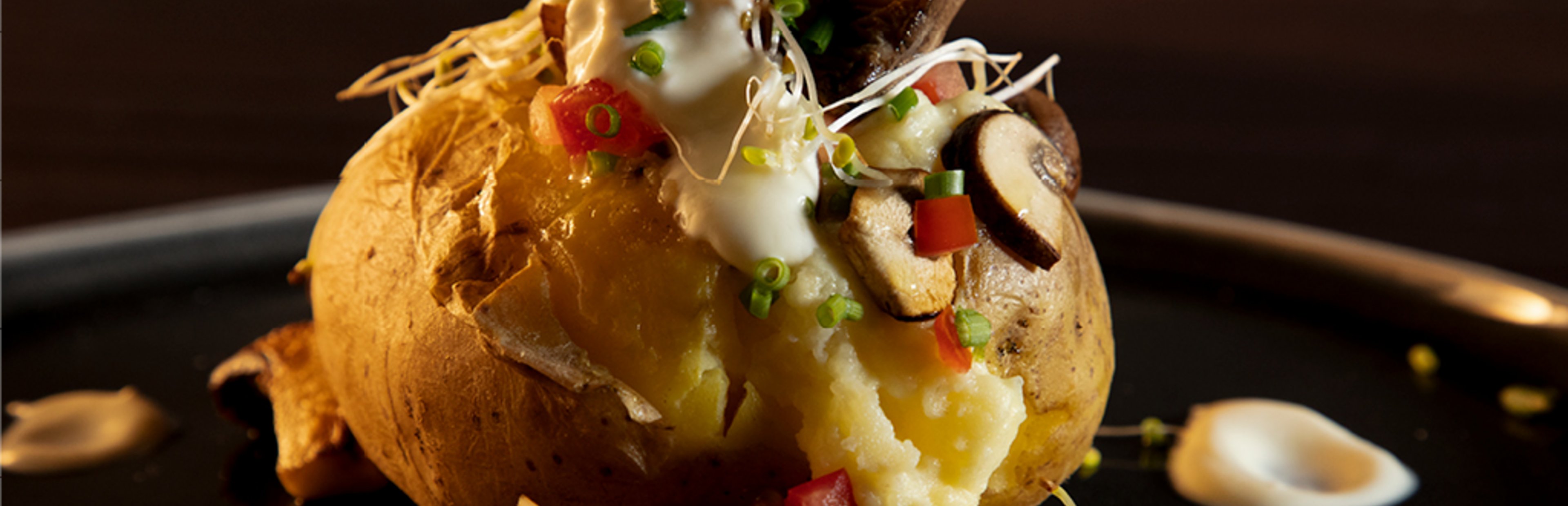 Die Pilze in Scheiben schneiden und in einer Pfanne scharf anbraten und würzen. Die Tomate entkernen, würfeln und hinzugeben. Den Schnittlauch fein hacken und darüber streuen. Die Pilze auf die vorbereitete Kartoffel geben. Oben auf die Kartoffel einen Teelöffel Crème fraîche geben und sofort servieren.