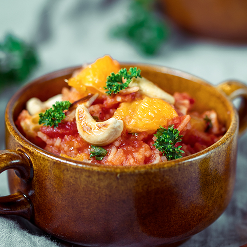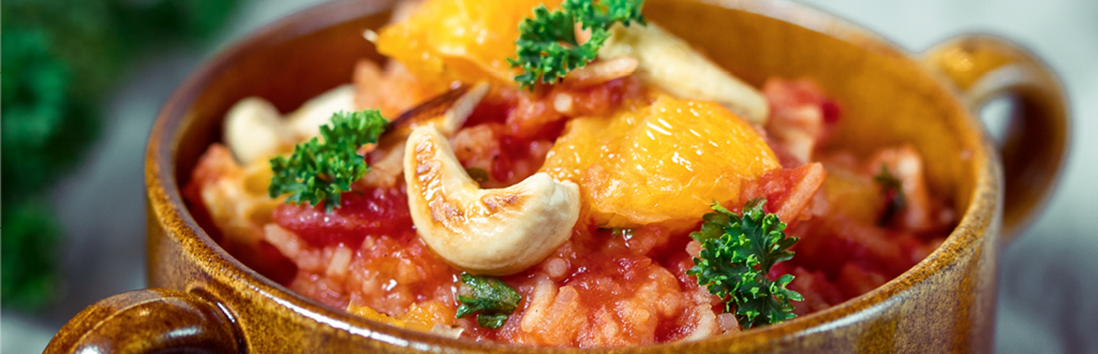 Die Orangen-Vinaigrette und die gerösteten Cashewkerne über den fertigen Reis geben und servieren.