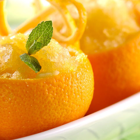 Die Deckel der Orangen abschneiden, Fruchtfleisch mit einem Löffel herausnehmen, mit einem Pürierstab pürieren und durch ein Sieb drücken. Den Secco erwärmen, den Zucker darin auflösen. Das pürierte Fruchtfleisch unterrühren und alles einfrieren (12 Std.). Mit einem Löffel das Granitée abschaben und in 4 Orangen (oder 4 Sektschalen) einfüllen. Bei Bedarf mit dem bioladen*Secco auffüllen. Mit Minz- oder Melissenblätter garnieren.