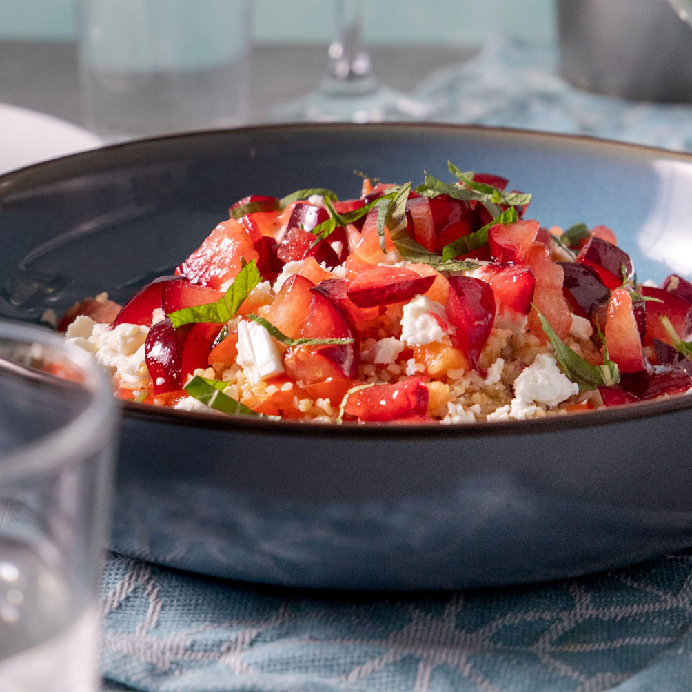 Bulgur mit der Pflaumen-Vinaigrette beträufeln und mit Feta bestreut servieren.