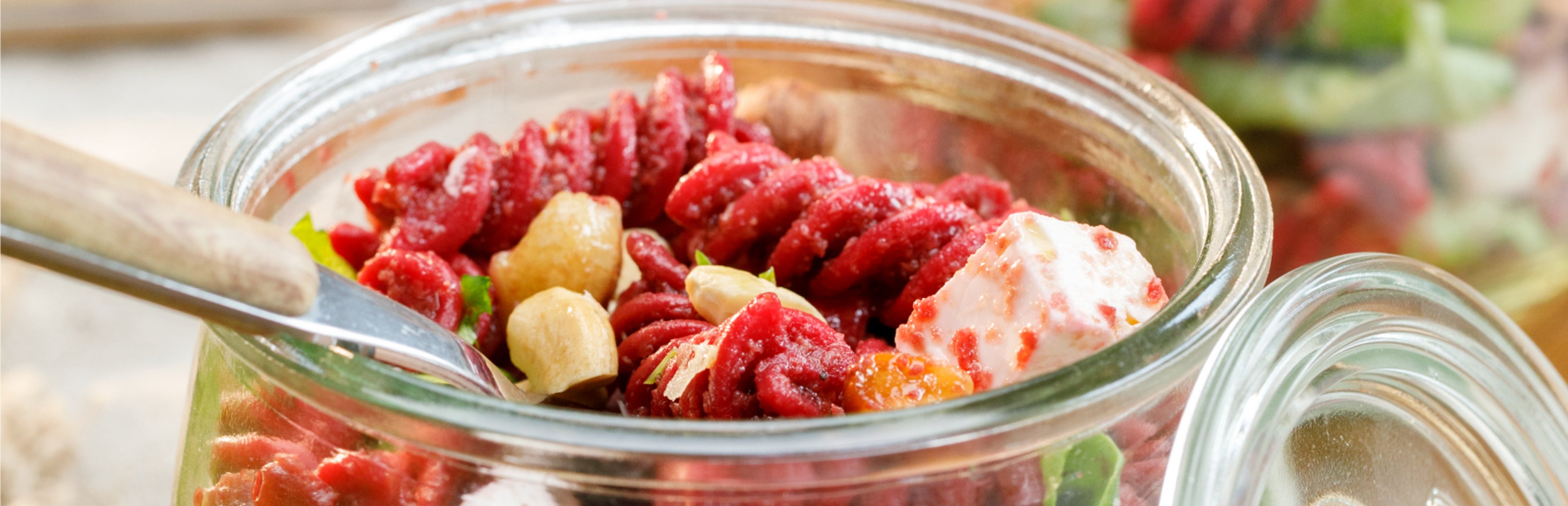 Knoblauch schälen und fein hacken. Rote Bete schälen und auf einer Reibe fein raspeln. 2 Esslöffel Öl in einem Topf erhitzen. Knoblauch und Rote Bete darin anbraten. Mit Salz und Pfeffer würzen. 2 Kellen Kochwasser der Fussili zur Rote Bete geben. 10 Minuten leicht köcheln lassen. Dann mit einem Pürierstab pürieren. Pasta zur Rote Bete geben, gut vermengen und abkühlen lassen.