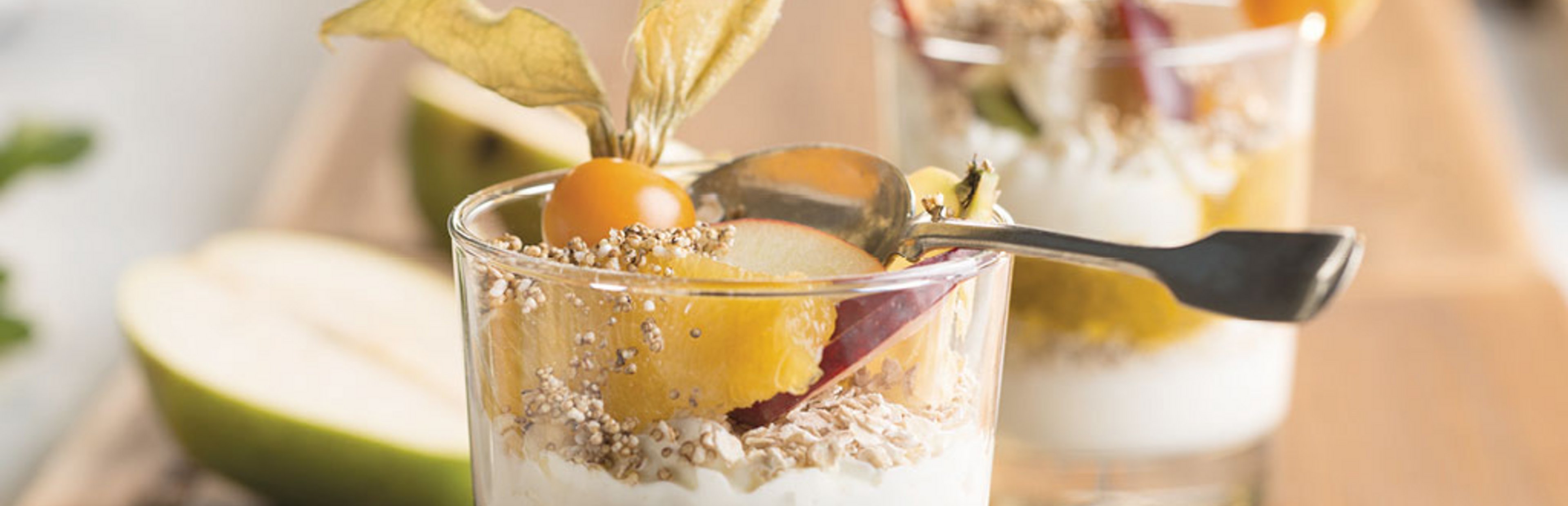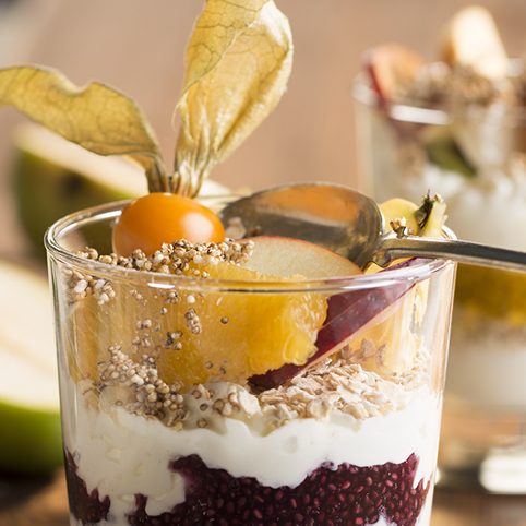 Chia-Samen und Joghurt abwechselnd in Gläser schichten. Darauf die Haferflocken und das Obst geben und mit dem Amaranth-Popp bestreuen.