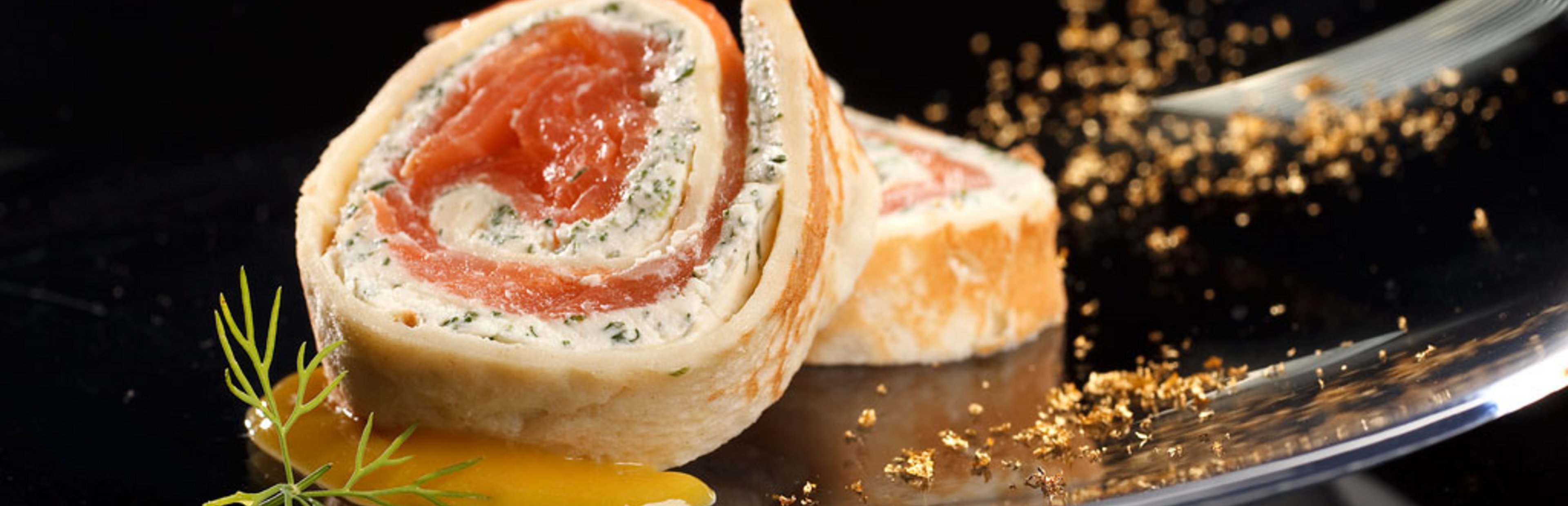 Den Pfannkuchen auf einem Brett ausbreiten mit der Creme bestreichen. Den Lachs gleichmäßig darauf verteilen und anschließend den Pfannkuchen aufrollen. 1-2 Stunden durchziehen lassen.