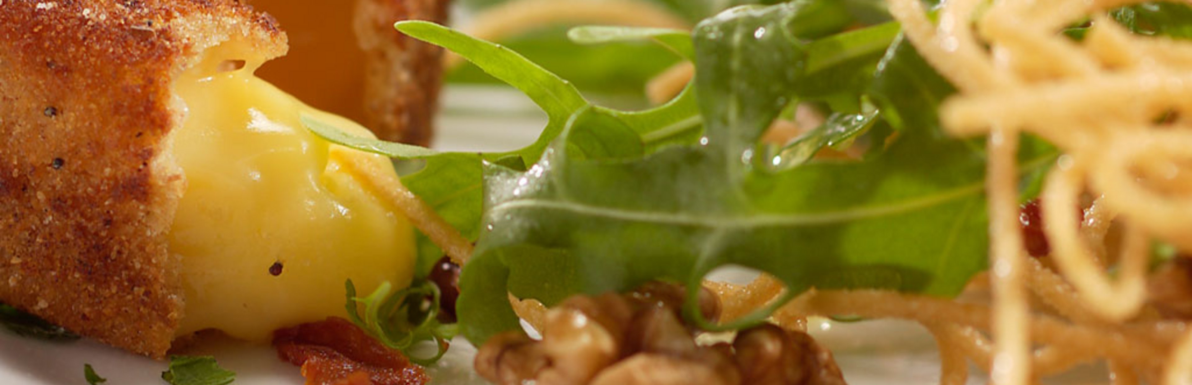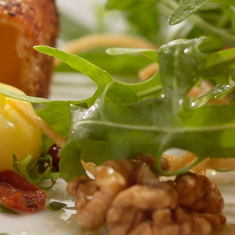 Den Brie-Käse in Würfel schneiden, zuerst im verquirlten Ei, dann im Paniermehl wenden und in Olivenöl anbraten. Die Walnusskerne grob hacken und alle Zutaten locker miteinander vermischen.