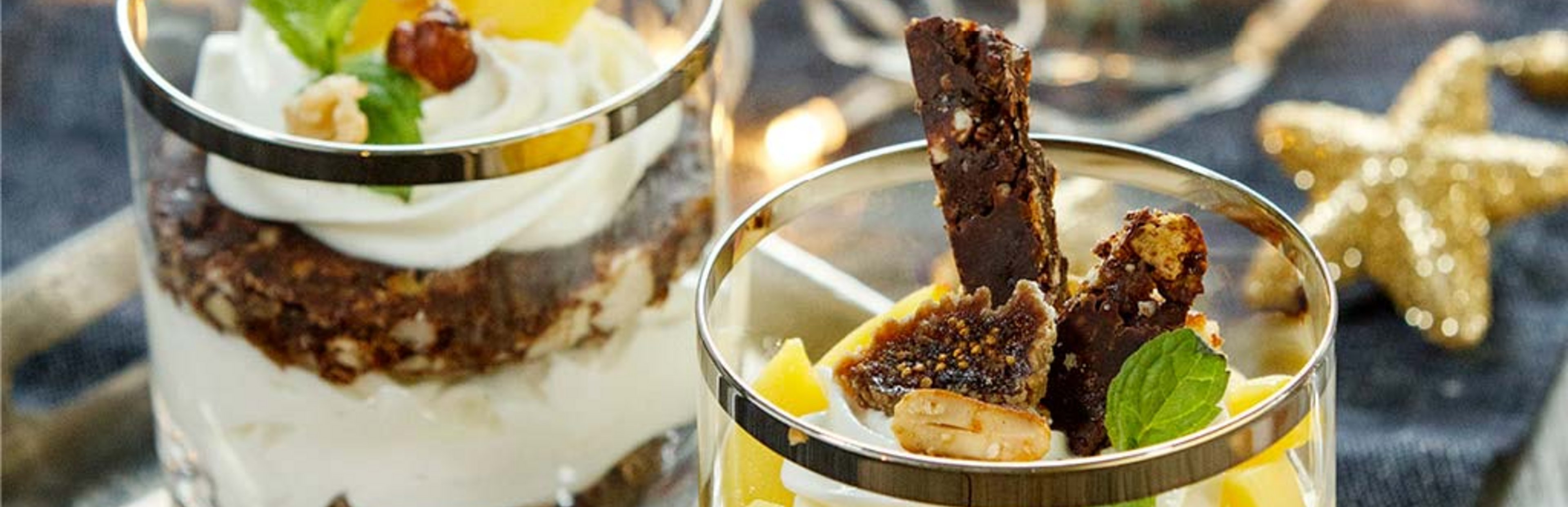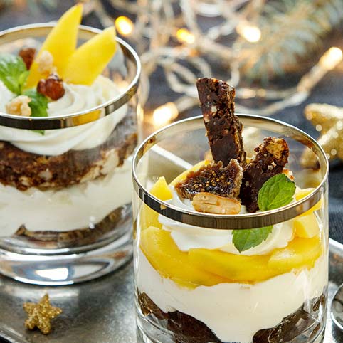 Die Mango in feine Scheiben schneiden und das Dessert schichten: zuerst die marinierten Trockenfrüchte, dann die Mascarponecreme, darauf die Mangoscheiben und als Topping die Schokostückchen.