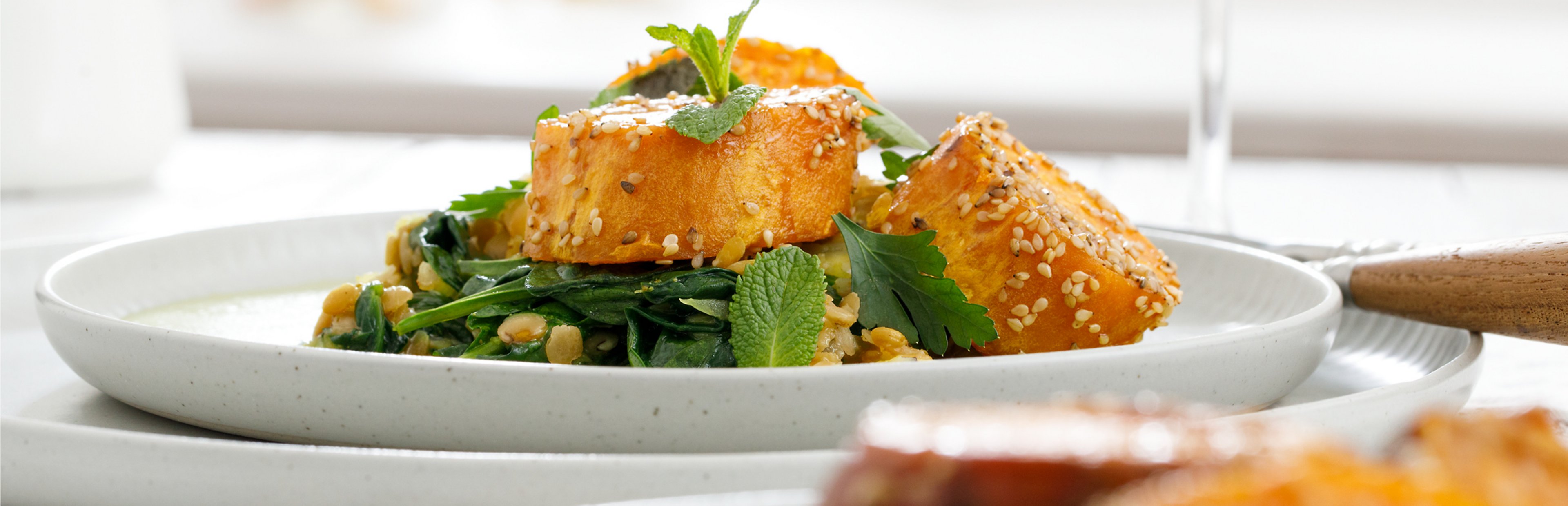 Sesam-Süßkartoffeln auf Spinat-Linsen-Gemüse