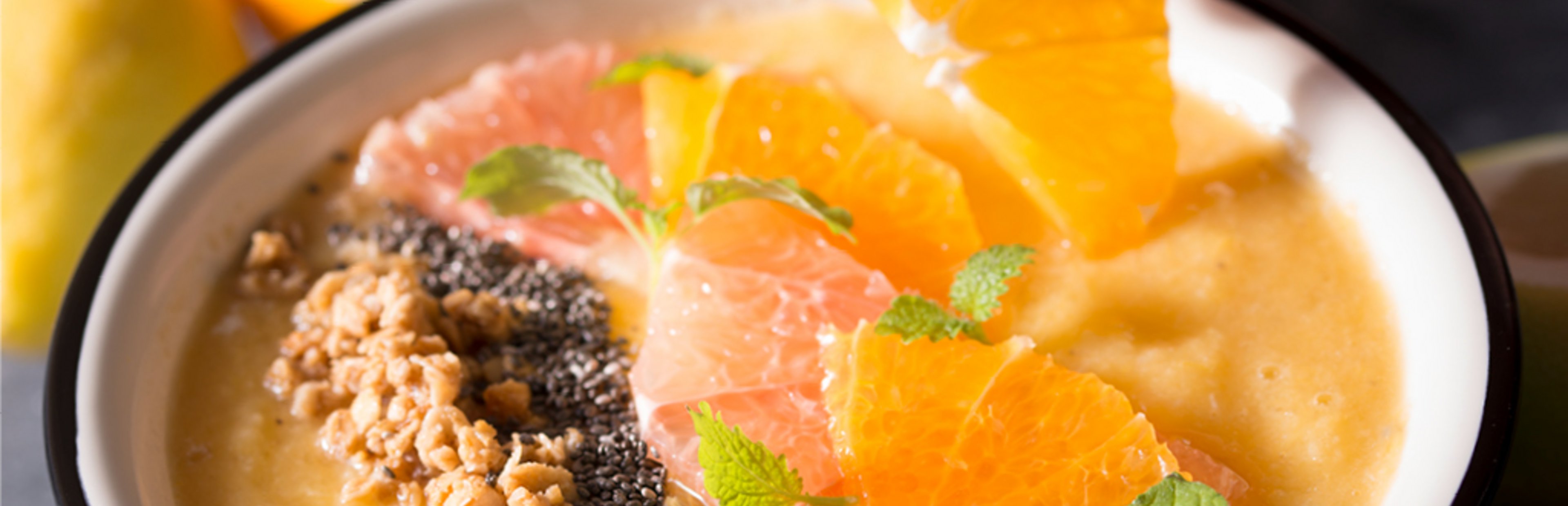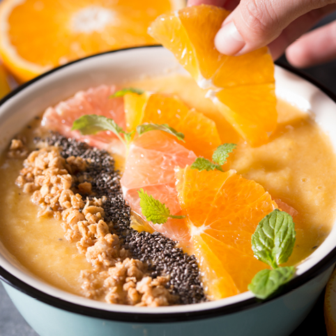 Die Orangen schälen und mit den anderen Smoothie-Zutaten fein pürieren. Die Smoothie-Masse in eine Schale füllen und mit Müsli, Chia-Samen und Zitrusscheiben belegen. Mit Melissen- oder Minzblättern dekorieren. Löffel rein und los geht’s!
