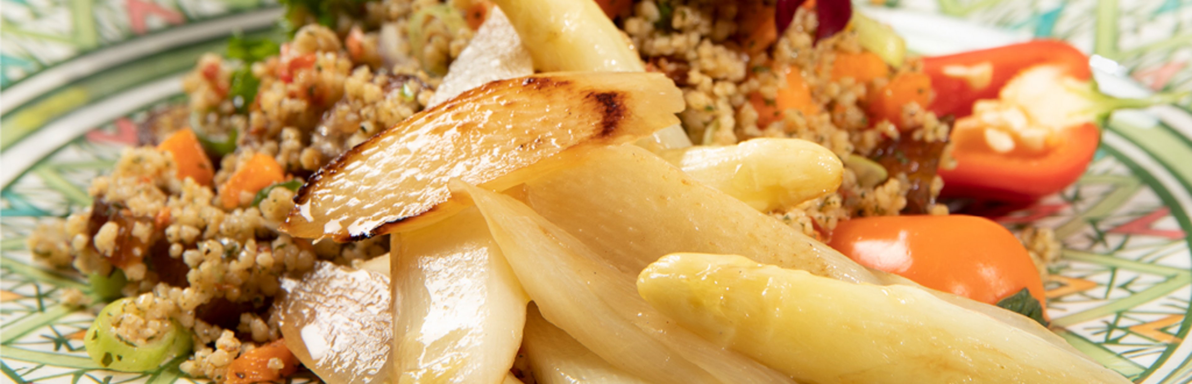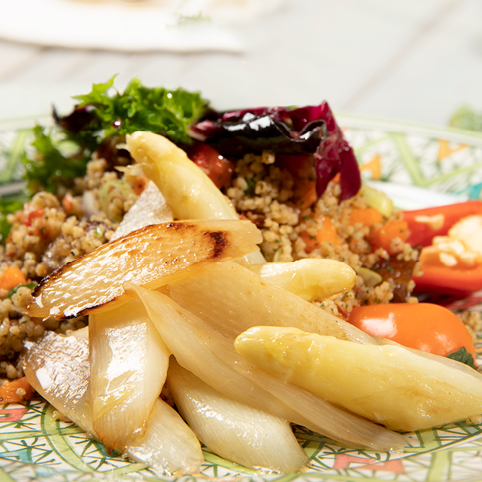 Die Spargelstangen ggf. schälen und schräg in Stücke schneiden. In etwas Olivenöl langsam anbraten und mit Salz, Pfeffer und Knoblauch würzen.