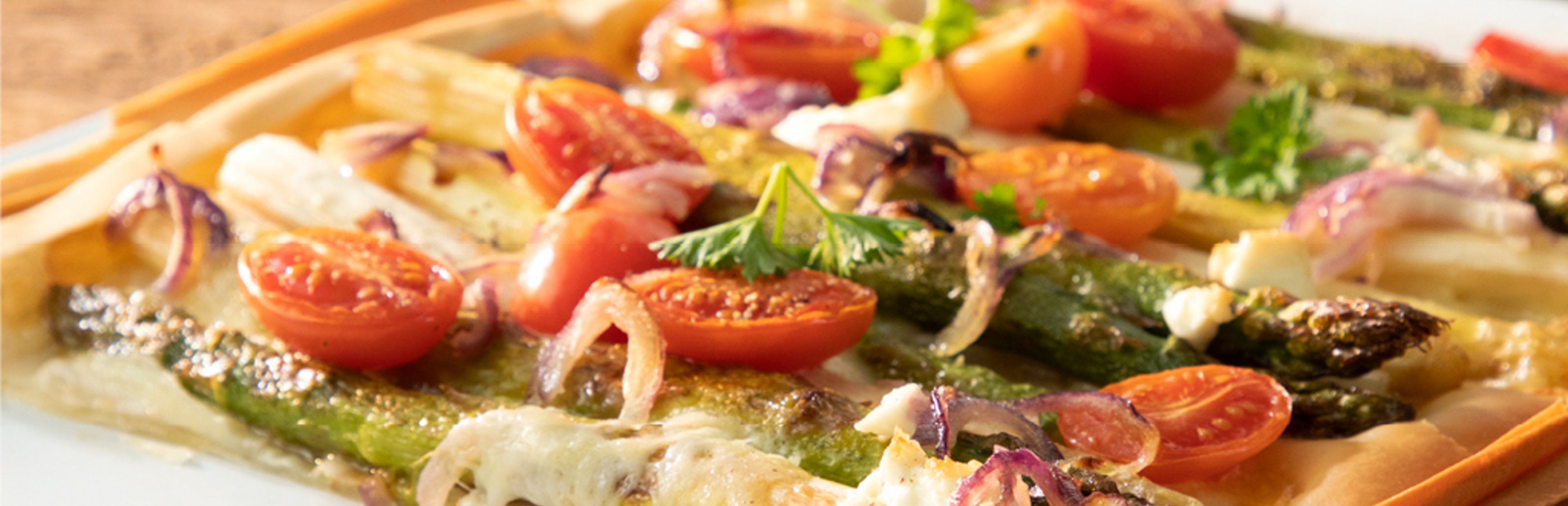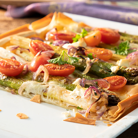 Den Mozzarella in feine Streifen schneiden und auf dem Strudelteig verteilen. Den Spargel und die Zwiebeln darauf verteilen. Die Cherrytomaten halbieren und auf dem Teig verteilen. Anschließend den Feta bröseln und darüber streuen. Etwas würzen.